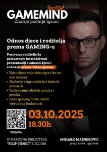 Predavač će biti Mihajlo Maksimović, programer i gejmer, koji će roditeljima približiti svijet video igara i ponuditi praktične savjete za balansiran odnos djece i roditelja prema gamingu.