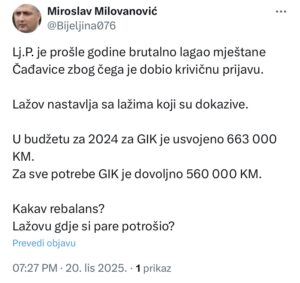 U svojoj objavi Milovanović je naveo da je u budžetu Grada Bijeljina za 2024. godinu za potrebe Gradske izborne komisije (GIK) usvojeno 663.000 KM, te da je za sve potrebe GIK-a „dovoljno 560.000 KM“. Upitao je gradonačelnika „kakav rebalans traži i gdje je nestao novac“, zaključivši porukom: „Kakav rebalans? Lažovu, gdje si pare potrošio?“