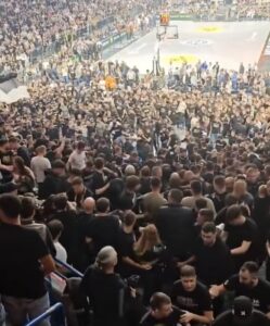 Tokom druge četvrtine utakmice Partizan – Pariz došlo je do sukoba dve navijačke grupe domaćeg tima na tribinama Beogradske arene.
