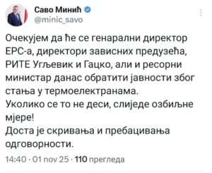 „Ukoliko se to ne desi, slijede ozbiljne mjere. Dosta je skrivanja i prebacivanja odgovornosti“, poručio je Minić na društvenoj mreži X.